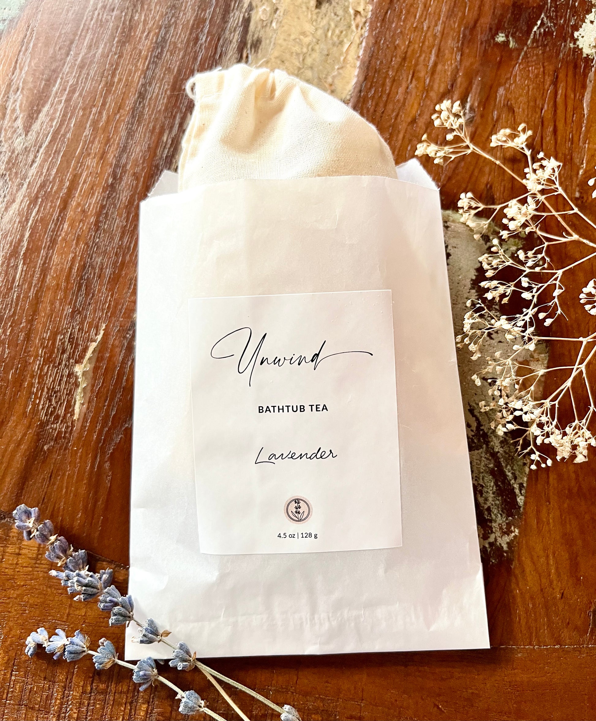 Our large 4.5-ounce Lavender Bathtub Tea has a soothing blend of lavender, avena sativa, and Himalayan pink salt to create a calming, nourishing, and relaxing bath experience.