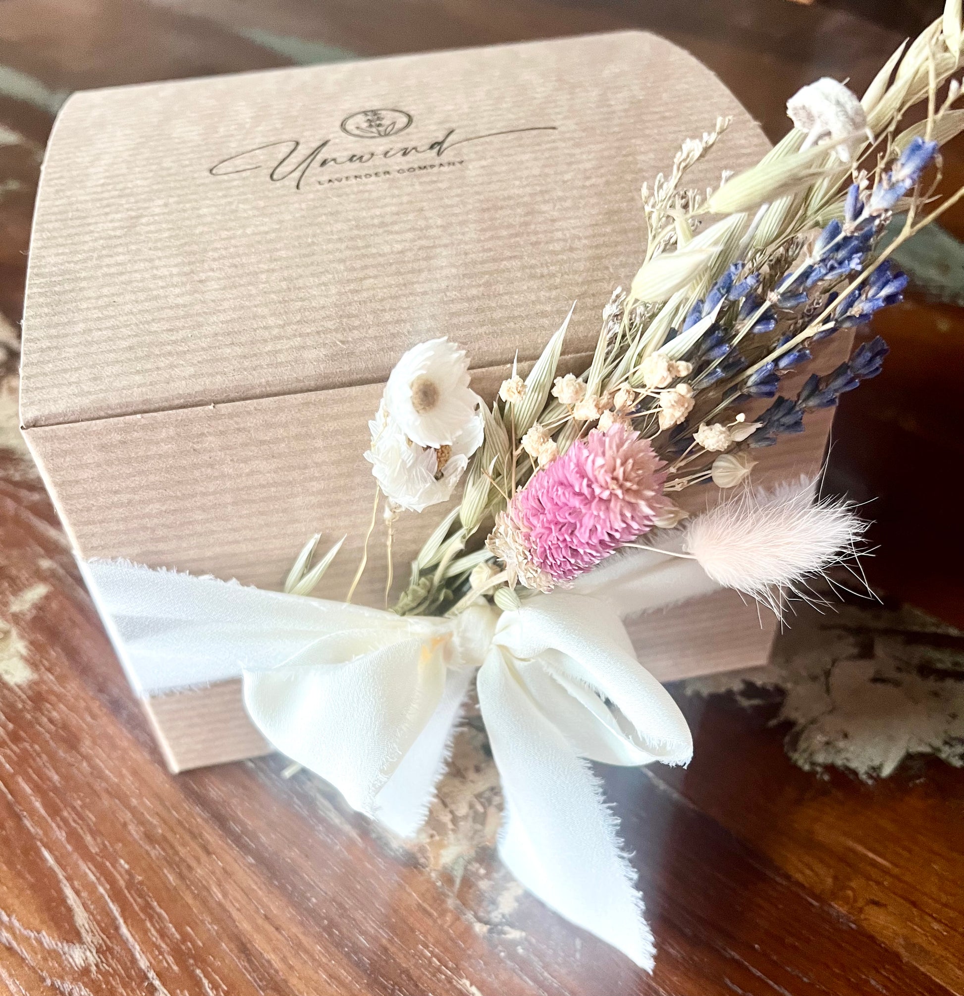 All of these items are elegantly presented in a 6x6x4 kraft gift box, tied with a satin ribbon, and adorned with a delicate dried flower decoration. The contents are nestled in ivory crinkle paper, adding a sophisticated touch to this beautiful package.