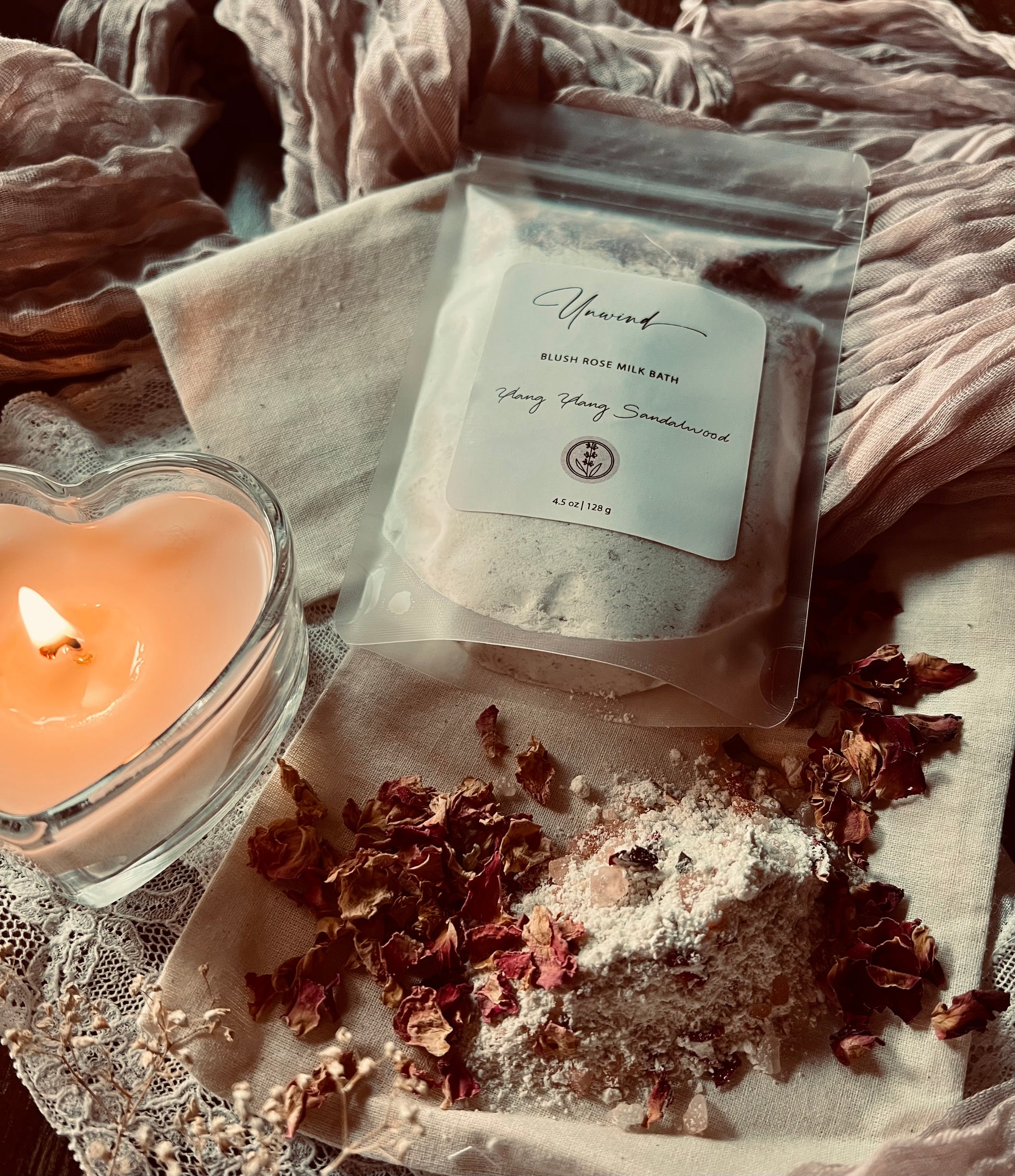 A thoughtfully curated pairing designed to celebrate love, relaxation, and indulgent moments. The Blush Romance Milk Bath invites you to unwind in a creamy, skin-softening soak made with buttermilk powder, finely ground Avena sativa, and Pink Himalayan sea salt. Warm sandalwood and floral ylang ylang essential oils create an intimate, comforting aroma, while pink and red rose petals transform your bath into a beautifully romantic retreat. For easier clean-up, use the included muslin bag.